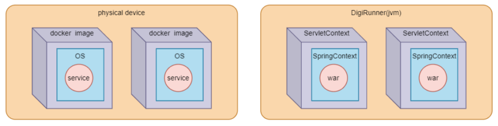 相信大家一定知道vmware或virtualbox是什麼吧!它們讓一個實體機內可以開多個VM,每個VM上面會有一個OS,OS上可以運行多個服務,而digiRunner採用了同樣的概念,只是更貼近了docker的容器架構:實體機→多個容器→每個容器內的OS→提供的服務(如左圖)。