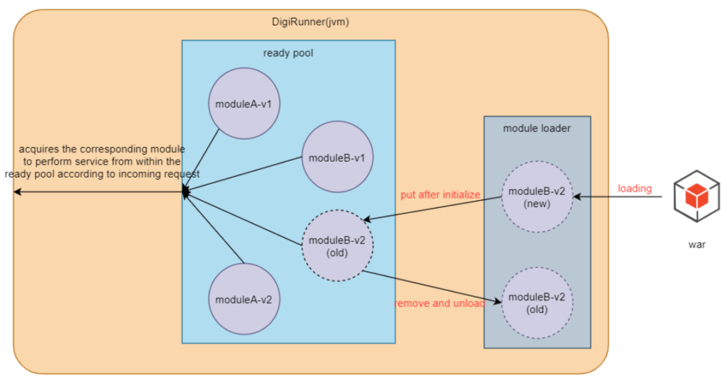 基於上述的管理機制,在熱部署階段就非常簡單了。首先透過規劃洽當的ClassLoader再搭配容器(ServletContext)的操作,就可以於背景先初始化該module(war),待初始化完成後就可以上線提供服務了(開放將request接進該module的ServletContext)。最特別的是若該module在讀取設定檔的部分若未做動態刷新載入的話,digiRunner可以控制重新熱部署讓module載入新的設定值,而這期間就是zero downtime的熱部署,如下圖示: